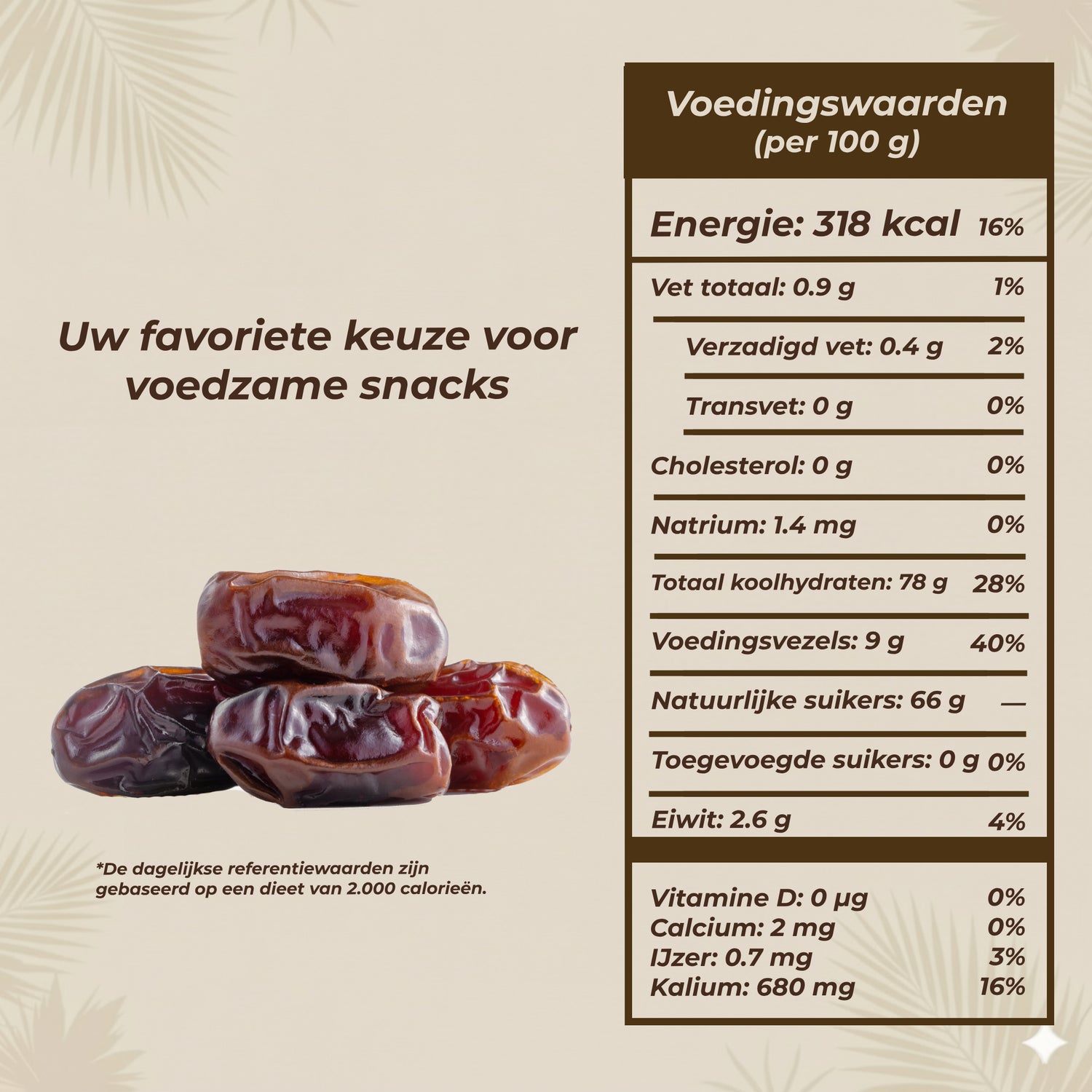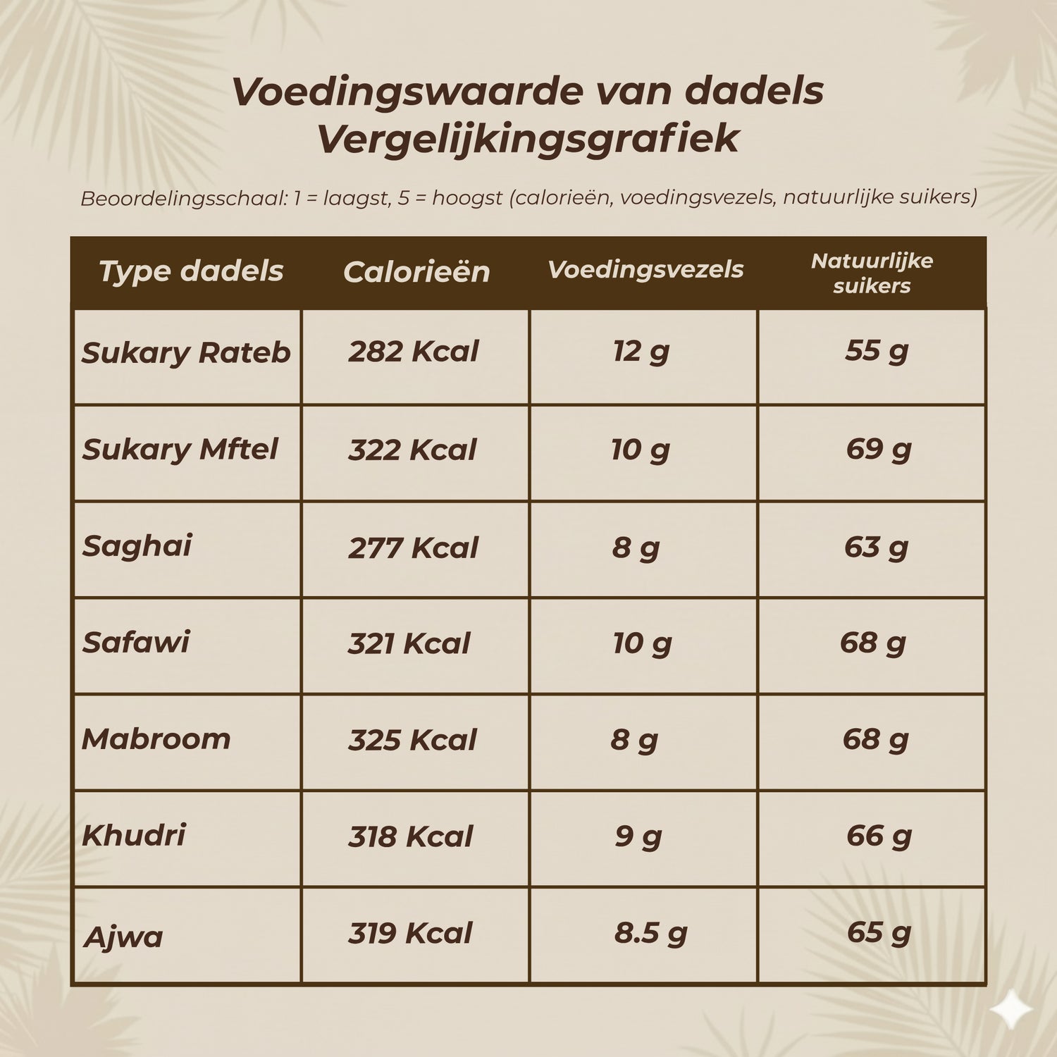 Met deze voedingswaardetabel kun je eenvoudig de belangrijkste gezondheidswaarden (calorieën, voedingsvezels en natuurlijke suikers) van elke Sanyeh-dadelsoort vergelijken. Of je nu op zoek bent naar de meeste vezels, magere energie of een goede eiwitbron, onze tabel maakt het kiezen van de juiste dadel eenvoudig en weloverwogen.