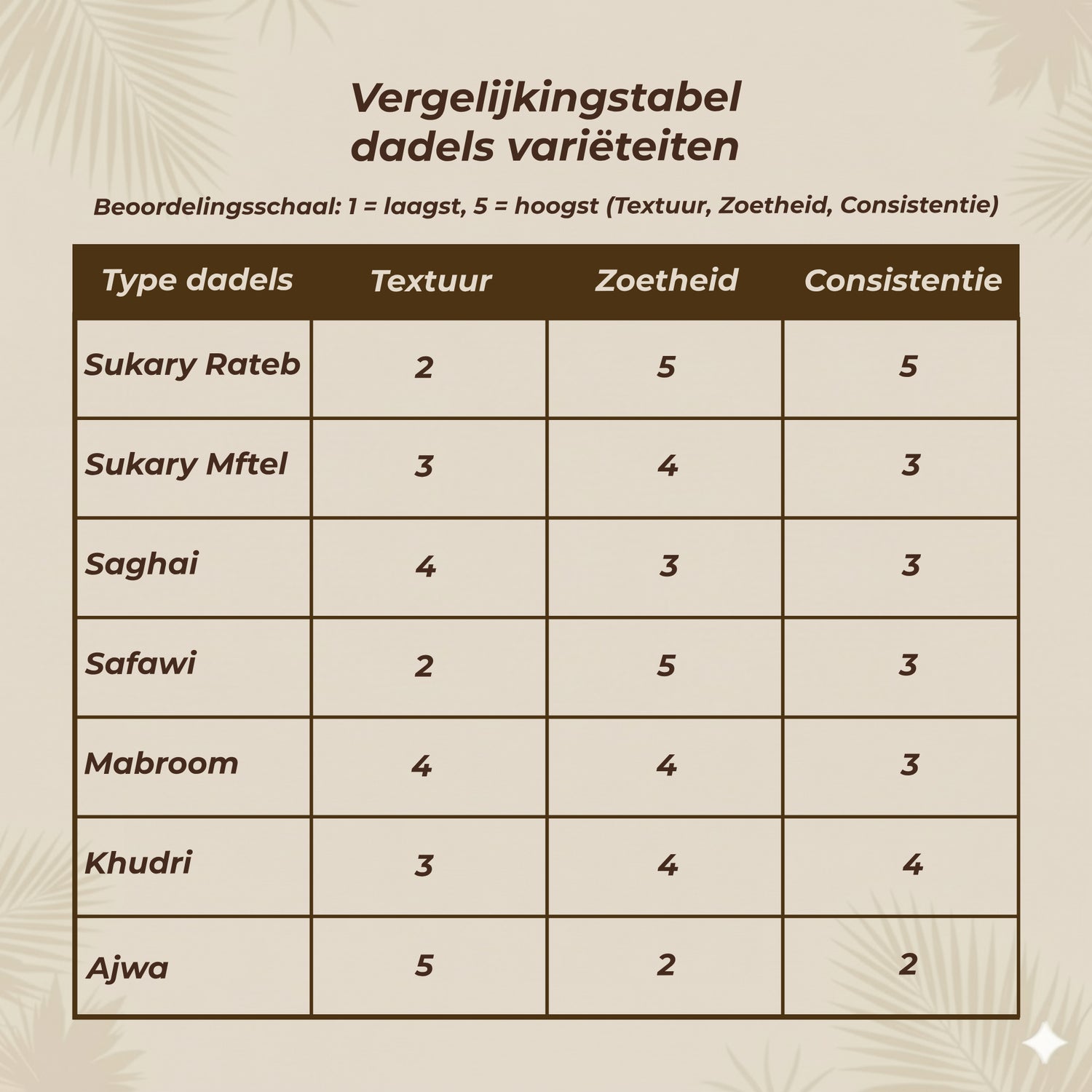 Vergelijk zeven premium dadelsoorten naast elkaar op textuur, zoetheid en consistentie. Gebruik deze tabel om gemakkelijk de variëteit te vinden die past bij jouw unieke smaak en voorkeur.
