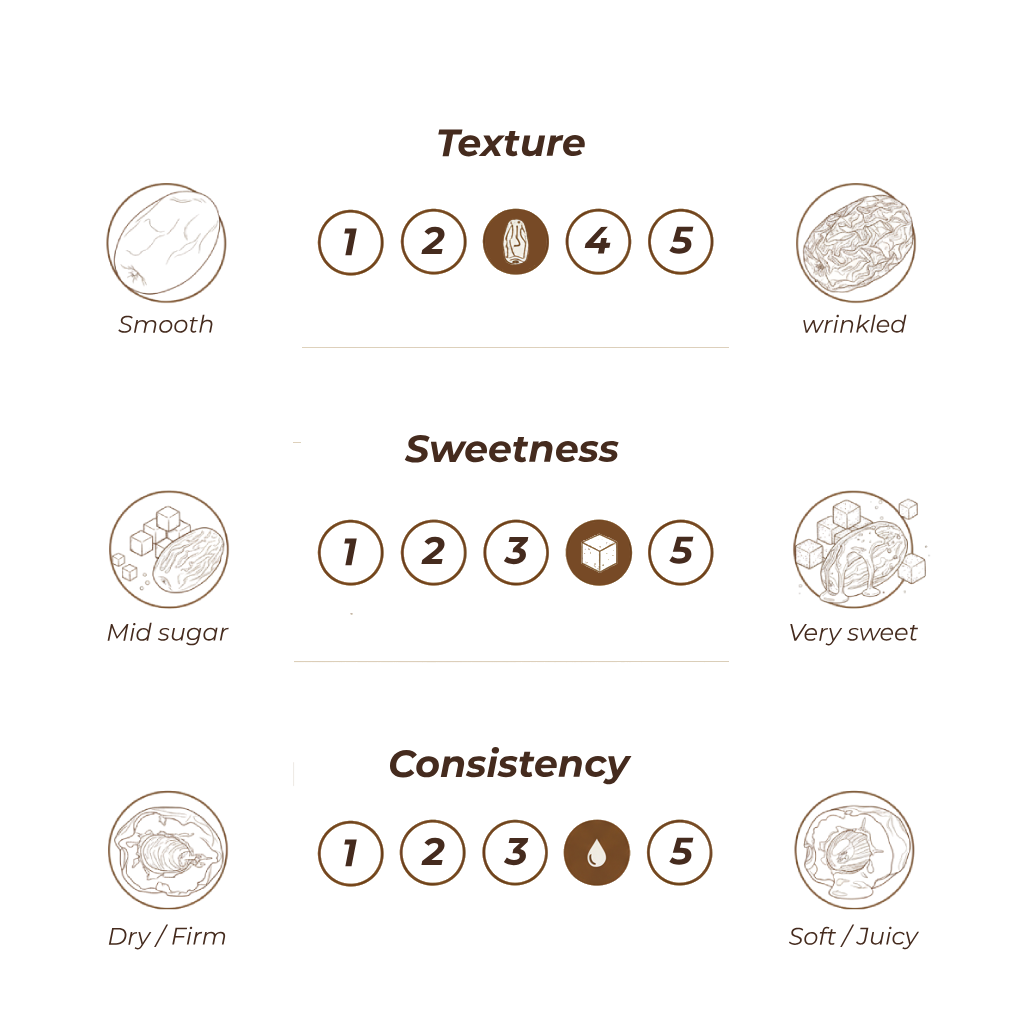Enjoy the balanced flavor of Khudri dates—dark brown with a slightly wrinkled skin and a pleasantly mild sweetness. Their chewy yet light texture makes them an everyday favorite and a versatile choice among date lovers. Each variety is thoughtfully rated for texture, sweetness, and consistency, helping you find the perfect match with confidence